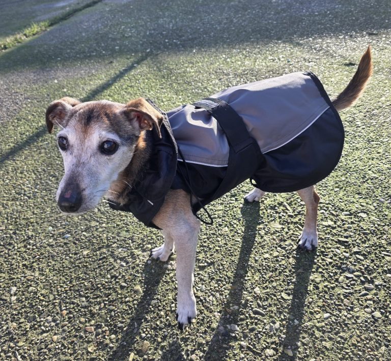 Voor koude dagen is er een warm jasje aan en om het zo aangenaam mogelijk te maken is een halsbandje niet toegestaan, alleen goed zittend tuigje. Kleine waarschuwing, Bono is best een slimmerd. Zijn dagelijkse pilletjes moeten echt fijn gemalen worden en dan met wat lekkers gemengd om te voorkomen dat hij het prima weet te herkennen en alleen het lekkers op eet.