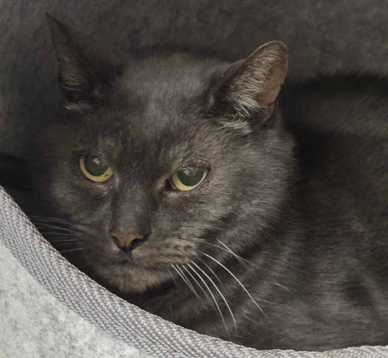 Oké hij kijkt wat grumpy op de foto’s maar dat valt in het echt reuze mee. Hij vindt alles wat spannend en trekt zich graag terug op een veilig plekje. Dat kan zijn in een holletje van de krabpaal of in zijn mandje hoog bovenop. In dit soort situaties waar hij kiest voor bon-sur-ton (grijs in grijs) geeft dat dagelijkse speurtochten met gespreksonderwerp: heb jij Cornuit gezien?? We vinden hem altijd ergens terug dus dat is positief.