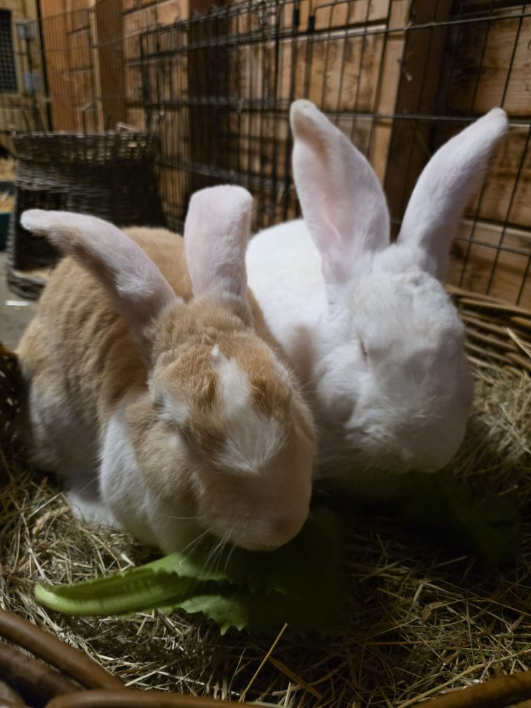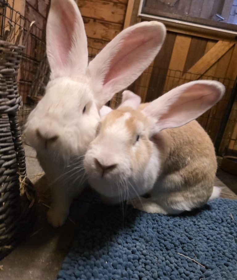 Letterlijk kanjers, dat kunnen we rustig zeggen. Diederik is het witte konijn, een rammetje inmiddels gecastreerd en Helen is de voedster, beige wit. Qua formaat en uiterlijk Duitse reus. Hun leeftijd is niet bekend. De dieren komen uit een minder goede situatie en mogen inmiddels herplaatst worden.