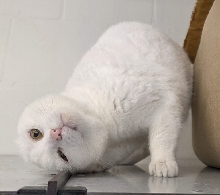 John is een bijzondere gecastreerde kater met geschatte geboortedatum: 04-06-2019. Eerst maar even een stukje feiten en voorgeschiedenis. Het dier liep al langer in de buurt te zwerven en kreeg helaas van de eigenaar niet de juiste zorg. Gelukkig trokken andere mensen het lot van hem aan en kwam hij bij ons in opvang. Witte katten lopen een groter risico op het ontwikkelen van huidkanker door het ontbreken van pigment, en dat is precies wat er met deze knapperd is gebeurd. Met een rare bult bij zijn oortje was het oordeel van de dierenarts duidelijk: hoogste tijd voor actie, zijn oortje moest geamputeerd worden.