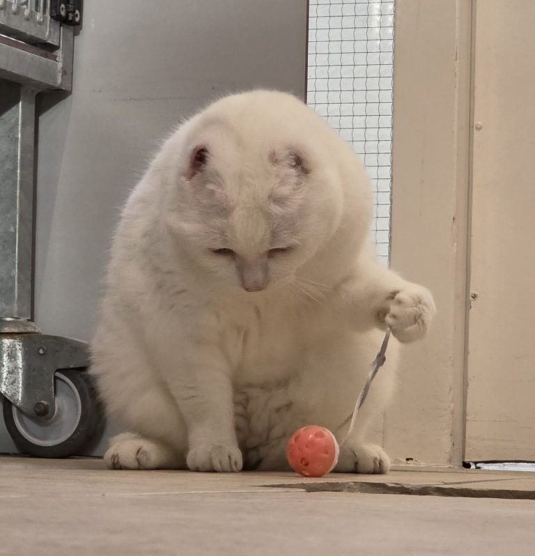 Zo gezegd zo gedaan, hij werd geopereerd aan zijn linker oor. Na een periode van herstel en genezing was het nog even spannend of er geen uitzaaiingen waren maar groen licht, alles was goed. Helaas was het rechter oortje ook niet helemaal zuiver en om ellende te voorkomen volgde dus een 2e operatie. Nu is John ‘de kat zonder oren’ hoewel dat technisch niet juist is want hij heeft nog wel oren, het inwendige deel. Alleen de oorschelpen zijn geamputeerd. In principe zou hij dus gewoon kunnen horen. Of hij dat ook 100% doet is een beetje de vraag. Bij witte katten kan een aangeboren vorm van doofheid voorkomen. Hij lijkt niet volledig doof maar enkelzijdig doof is zeker een mogelijkheid.