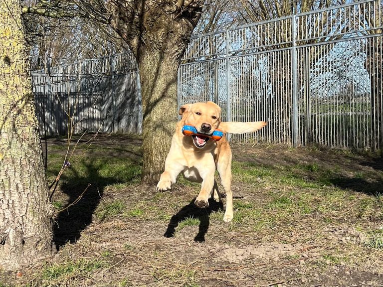 Zoals gezegd is hij buiten met wandelen vooral bezig met zijn neus, alle geurtjes opsnuffelen, geen tijd om achter een speeltje aan te rennen. Op eigen terrein heeft hij die focus beter. De informatie verteld dat hij veel geleerd heeft zoals zit en af enzo, alleen houdt Lubbe die kennis grotendeels geheim want wij hebben het nog niet helemaal ontdekt.