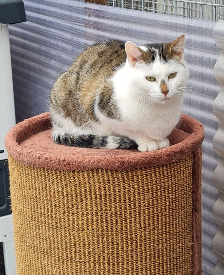 Mascha is een knap cypers met wit poesje, een poosje geleden keurig gecastreerd en met geschatte geboortedatum: 02-04-2024. Met een groepje katten via een collega-dierenorganisatie bij ons gekomen en als enige bleek ze in verwachting. Gelukkig mocht ze een poosje gaan wonen bij een lief gastgezin waar ze haar kittens veilig groot kon laten groeien. Daarna kwam de hele familie weer terug in het asiel. De kittens zijn allang geplaatst, nu mama nog.
