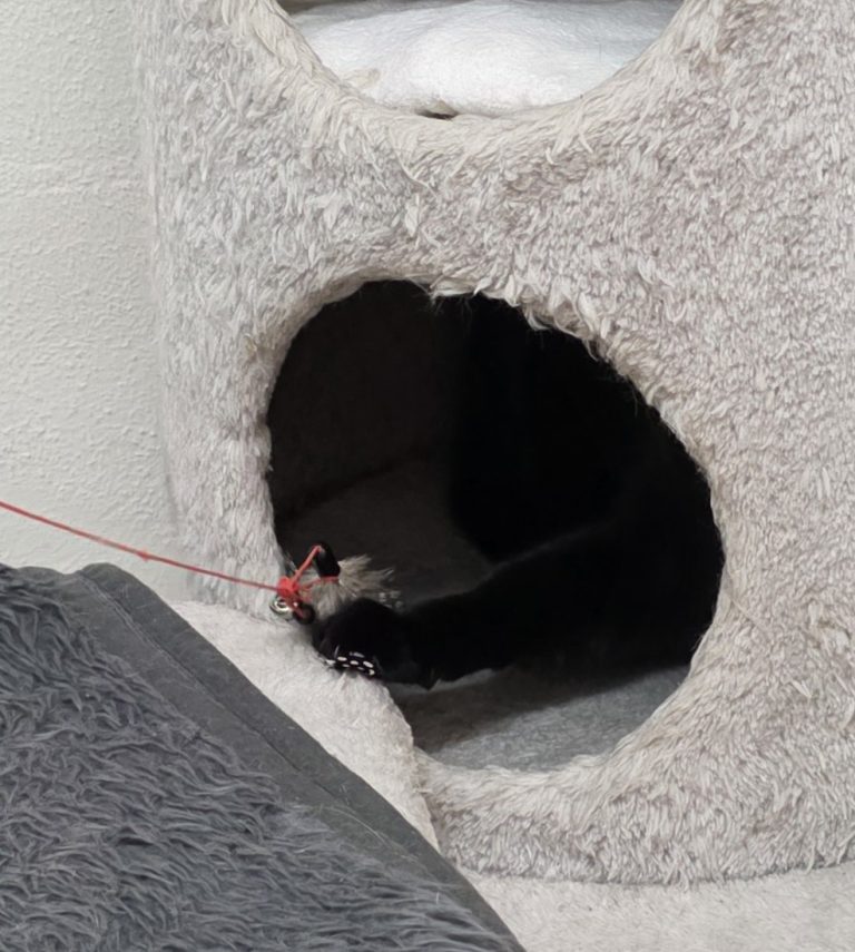 Het is een voorzichtig katje, ze laat zich heus wel zien maar foto’s maken haar verlegen dus ziet u voornamelijk een zwart vlekje in een schuilhuisje. Aanraken en aaien? Met een heel rustige opbouw mag het wel, liever blijft ze wat afstand houden. Tijdens haar plaatsing is het niet gelukt om het contact langzaam op te bouwen, als de goede adviezen niet worden opgevolgd… Later bleek ze ook in huis te plassen en ging ze buiten wonen. Dat was natuurlijk niet de bedoeling. Bij haar terugkomst in het asiel is ze medisch nagekeken en volgde urinecontrole. De oorzaak van het plassen bleek al snel: blaasgruis. Vervelend maar prima op te lossen met dieetvoer (Royal Canin S/O). Ze mocht eerst een tijdje herstellen in groepshuisvesting, weer in balans komen en dat is gelukt. Alle plasjes gaan keurig op de (open) kattenbak, niets mis mee. Ja, het voer is blijvend maar toevallig vindt ze het erg lekker.